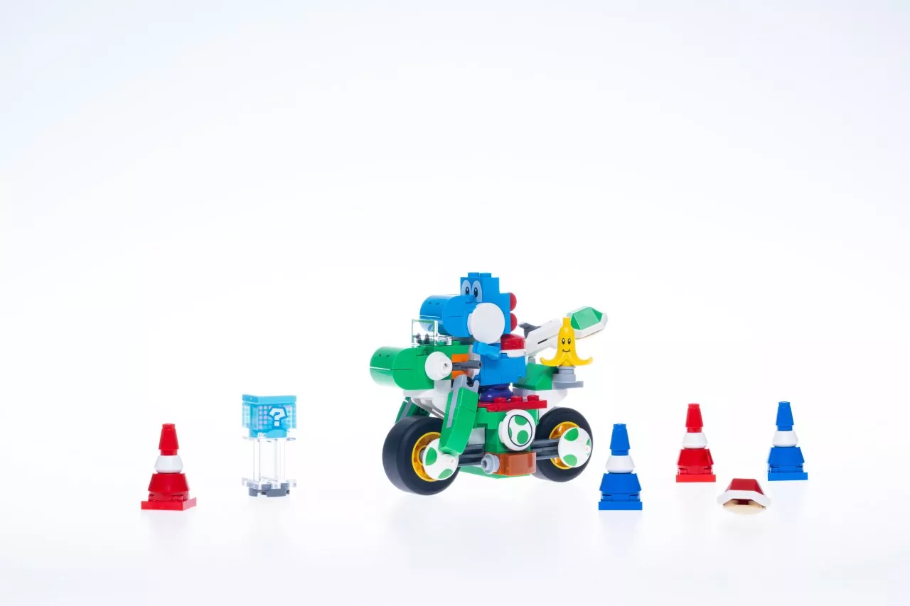 One of the smaller sets in this new line is the Mario Kart – Yoshi Bike, priced at £12.99 / $14.99. This set includes 133 pieces and features a model of Blue Yoshi with his bike, along with cones and an item crate to recreate the racing experience. Despite its smaller size, the Yoshi Bike set captures the essence of Mario Kart with its vibrant colors and dynamic design.