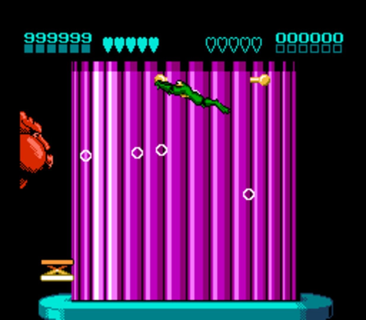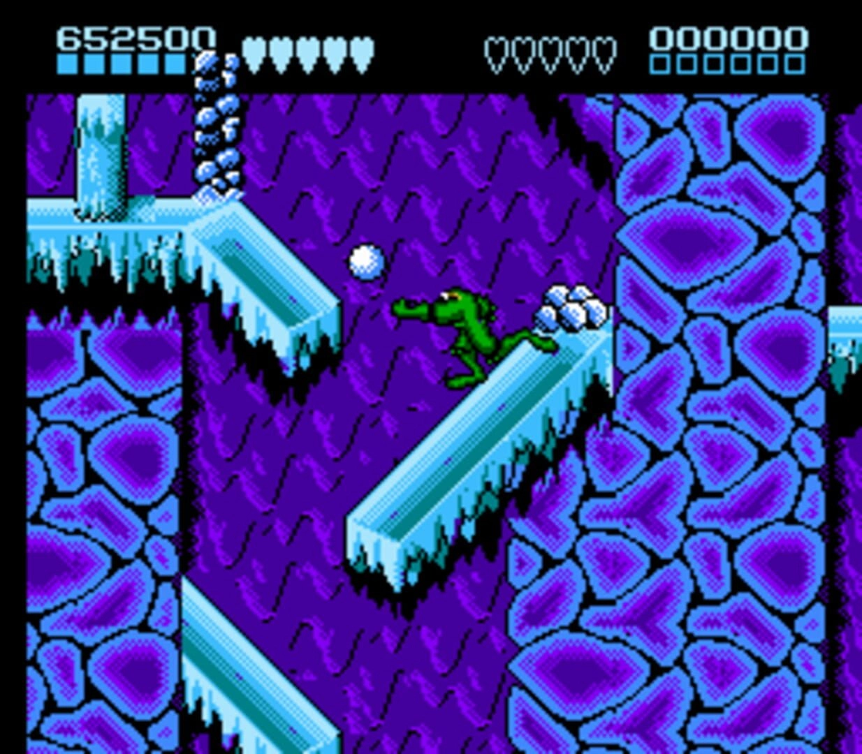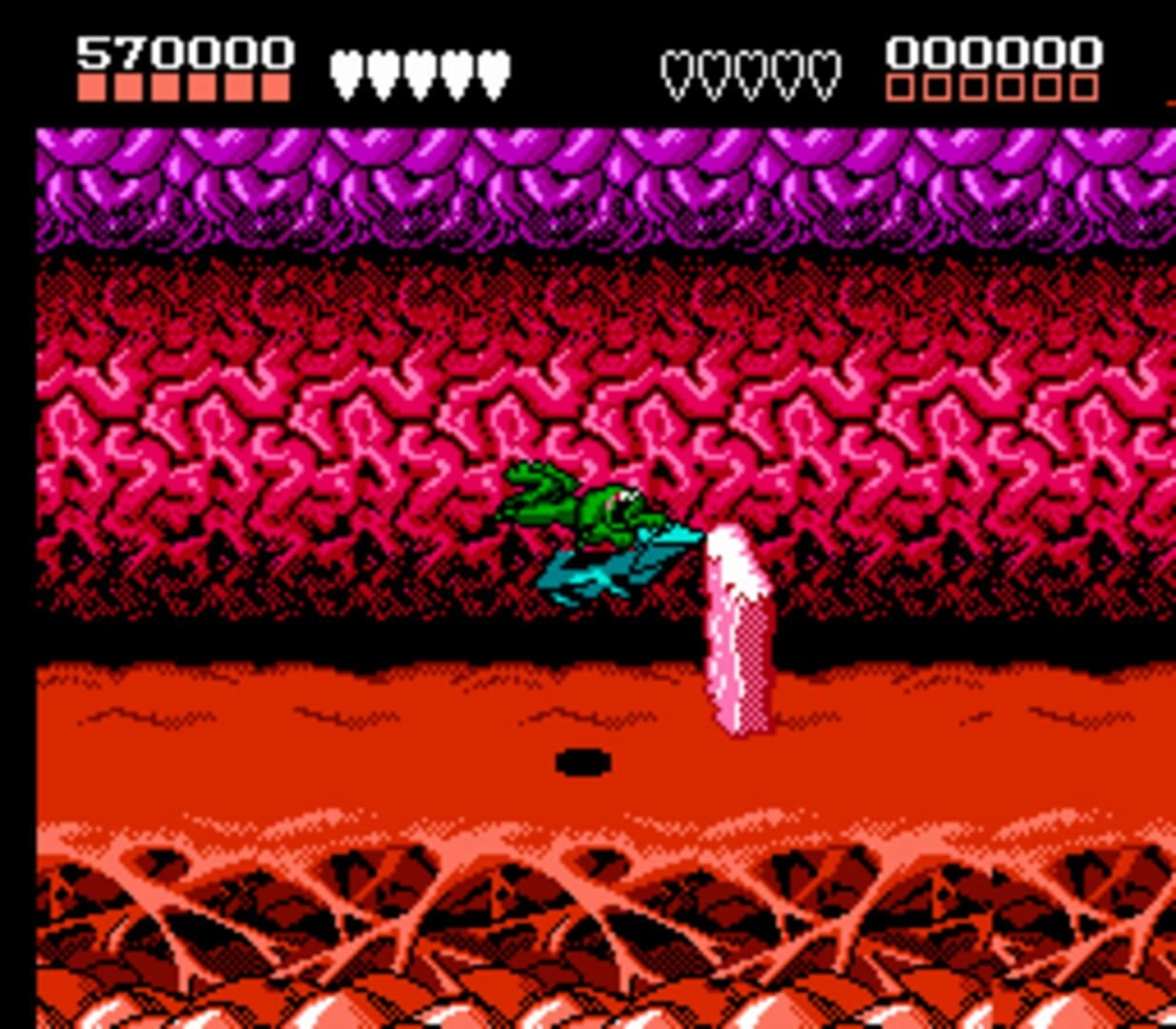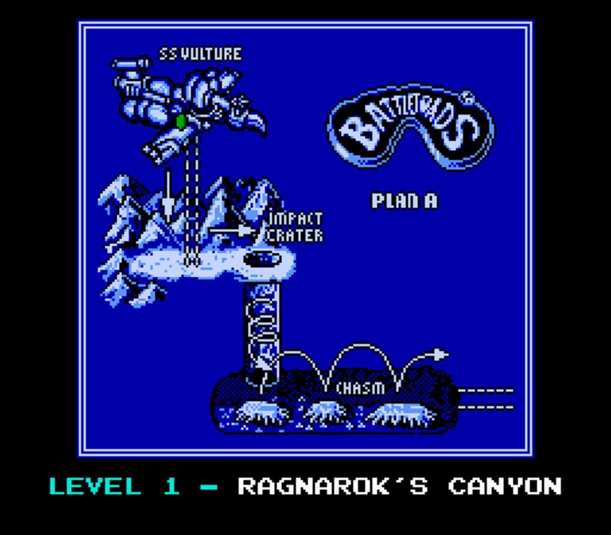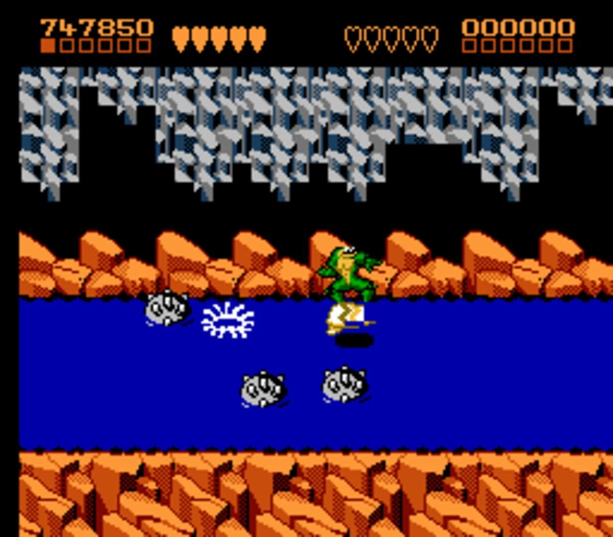 When starting the game, players are given three lives which are replenished each time they continue after being defeated. Unlike many other games, Battletoads does not include a saving system or password feature, meaning that players must complete the game in one sitting or restart from the beginning each time.