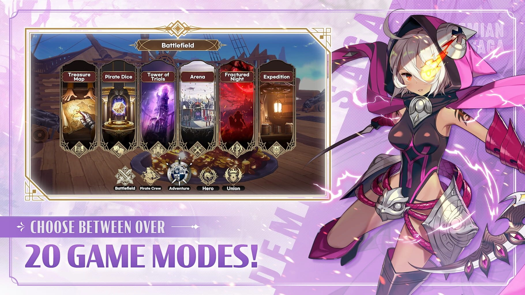But wait, there's more! Demian Saga: Chrono Pirates is not just about single-player adventures. The game also offers massive real-time PvP content that allows up to 200 players to battle it out. Join one of the four unions (guilds) and form alliances with your fellow pirates. Compete in thrilling PvP battles, prove your skills, and become the most feared pirate on the high seas! With such a large-scale PvP feature, there's never a dull moment in Demian Saga: Chrono Pirates.