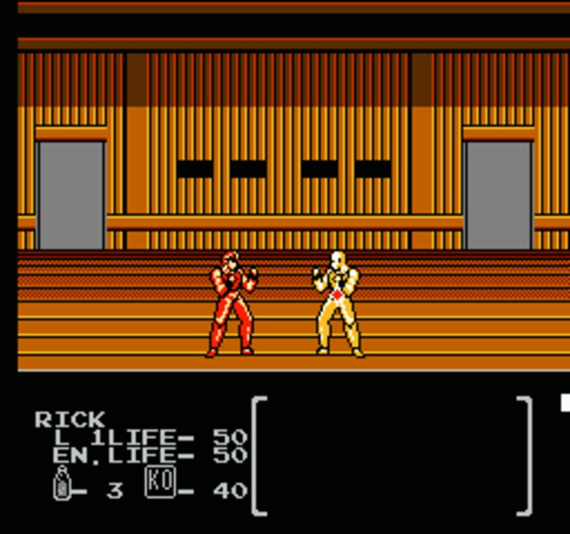 Flying Warriors offers a dynamic gaming experience with various combat formats. Players can engage in scrolling stages, using their kicking techniques and fireballs to defeat monstrous enemies. In one-on-one duels against Tusk Soldiers, players must deploy their martial arts skills effectively. Additionally, the game features a pair of martial arts tournaments where players must attack a specific mark on their opponent's body or defend themselves when the mark appears on them. This unique system is reminiscent of Culture Brain's original Flying Dragon for the NES.