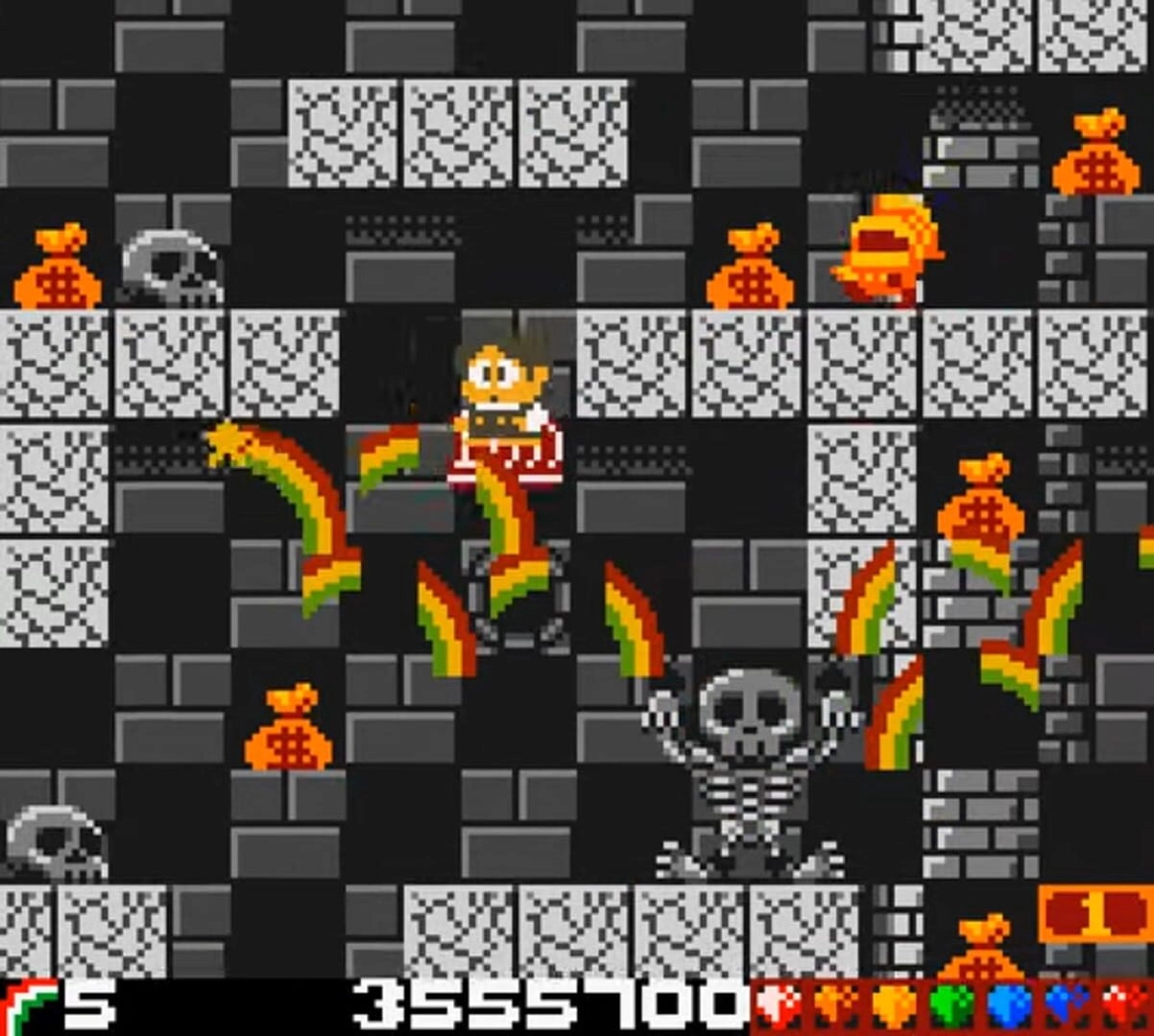 Throughout the game, players will encounter a wide range of enemies, each with different behaviors and attack patterns. Some enemies can fly, while others crawl on the ground, making it important for players to utilize their rainbow powers strategically. Additionally, various power-ups are scattered throughout the levels, providing benefits such as extended rainbow range or increased speed.