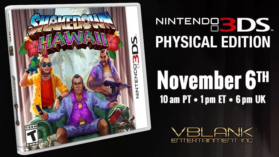 Just when everyone thought that the days of new releases for the 3DS were over, companies continue to surprise enthusiasts. This time, the excitement is stirred by VBlank, announcing a physical version of Shakedown: Hawaii. Arrival of this exciting game will take place on November 6th, with pre-orders starting on the same day.