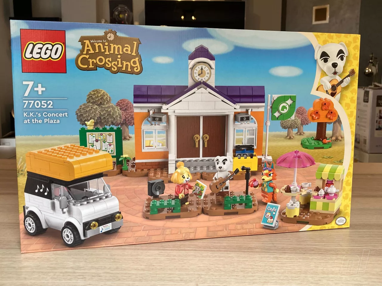Contained within the LEGO set are six bags of bricks that piece together into a charming representation of the game's town plaza. The set includes a cafe, K.K. Slider with his RV, and the town hall facade complete with a clock, a noticeboard, and a flagpole. It also features minifigures of K.K. Slider, Audie, and a new version of Isabelle in a pink hoodie.