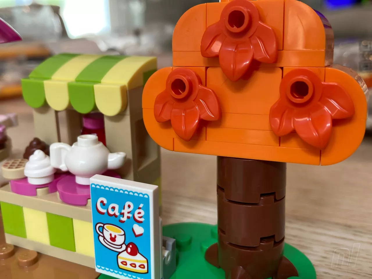 Starting with the cafe, LEGO has chosen to capture the quaint atmosphere of Animal Crossing's in-game coffee spot. Although simple, the cafe build introduces vibrant yellow and green color schemes and incorporates little details like cupcakes and a tea set. An exclusive autumnal orange tree adds a unique signature to the set.