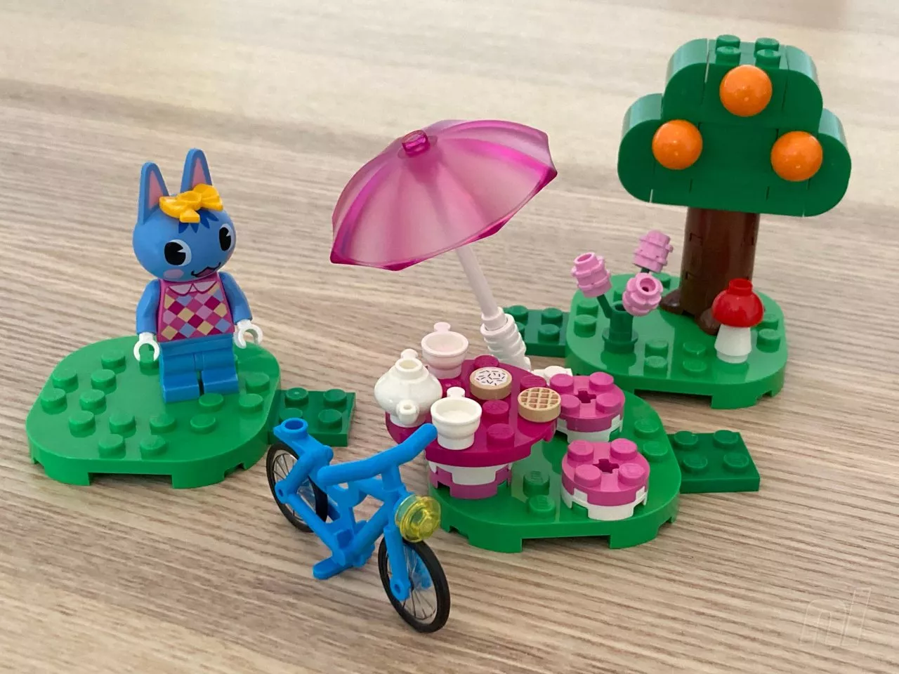 Starting with Rosie's House, the eponymous character's LEGO figure displays an appealing design, though her tail poses some minor inconveniences regarding mobility within the set. Rosie's surrounding elements—an orange tree, tea set, parasol, and a charming blue bicycle—exude the game's peaceful essence, enhanced by small extras like a quaint toadstool under the tree.