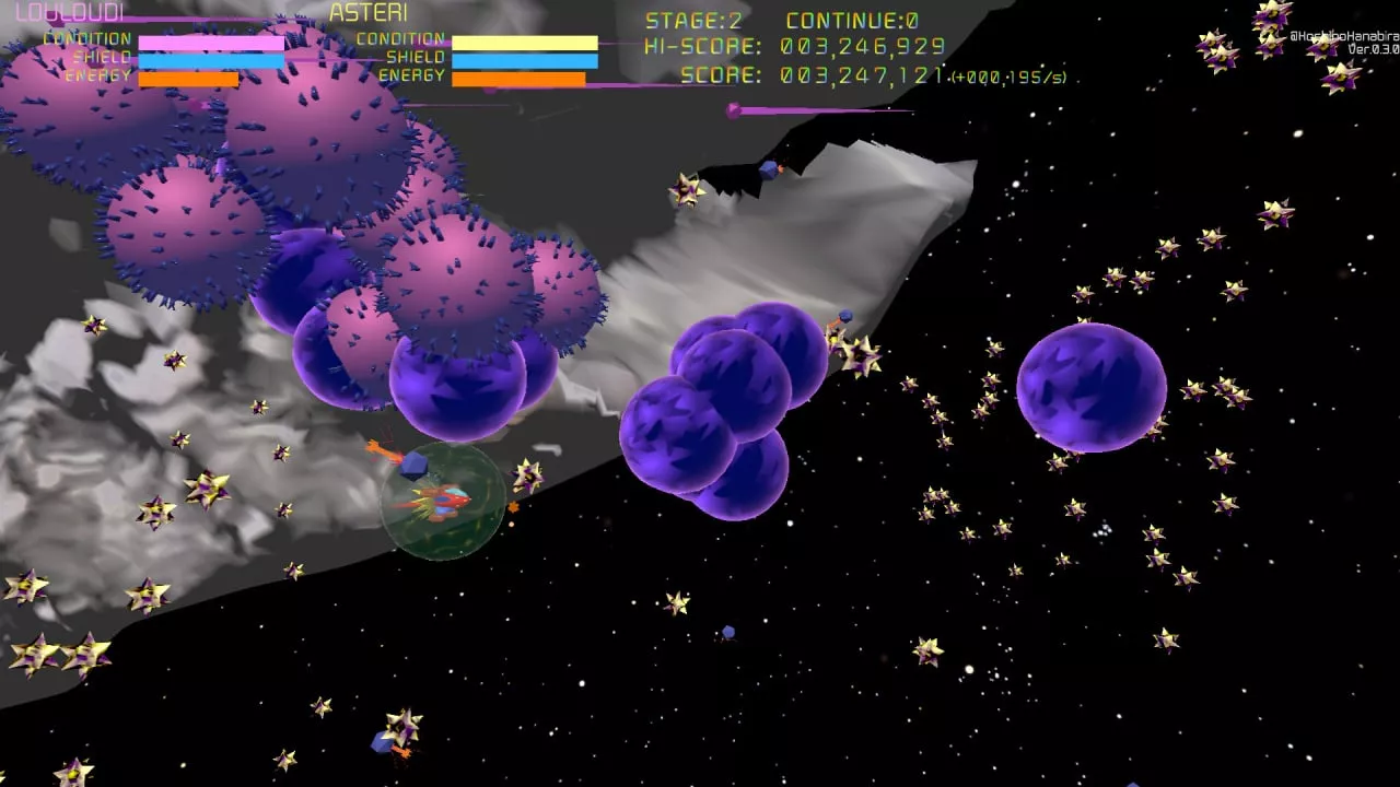 Louloudi Asteri adheres to the classic shoot 'em up motif, where players navigate from left to right, annihilation of enemies being their primary objective. However, the game reinvigorates the traditional format through its 3D mechanic. This innovative feature allows players to rotate their ship and the camera angle, giving them the strategic advantage of dodging incoming attacks and reaching targets that are otherwise out of the line of sight.