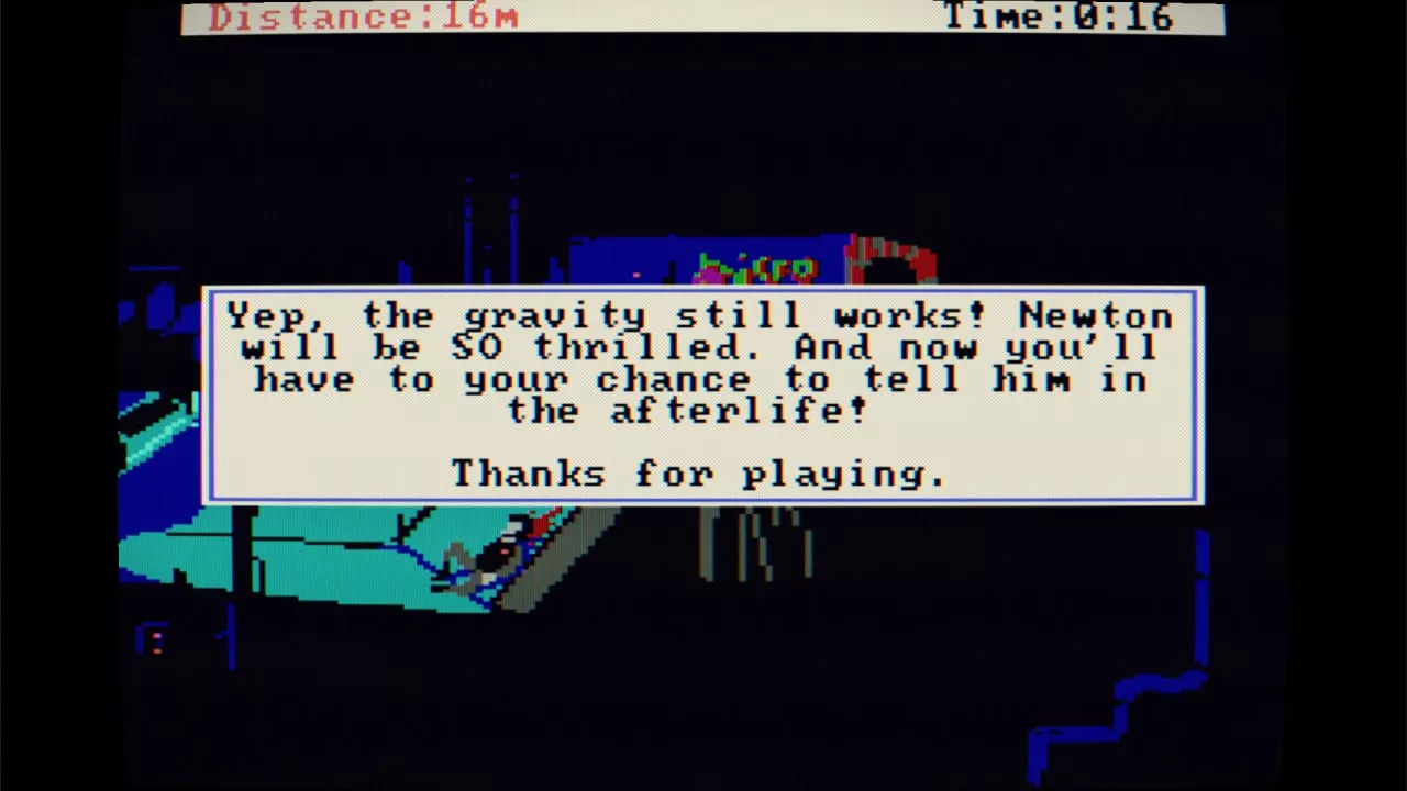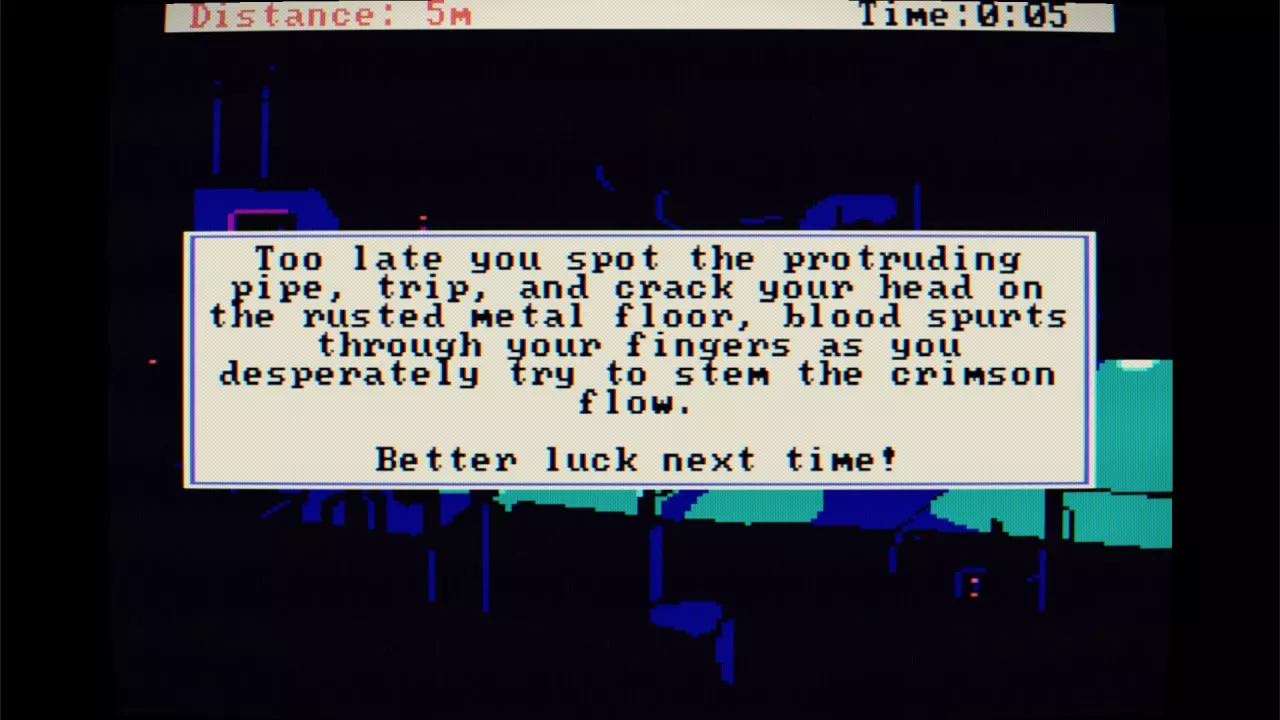 Despite its potential for frustration due to its no-backtrack rule and the easy-to-encounter death screens, the game maintains a light-hearted and engaging tone. The humorous death screens are inspired by Sierra’s legacy, where unique animations and witty comments made failing almost as enjoyable as succeeding. Moreover, the game loops its challenges, encouraging players to improve their situational awareness and problem-solving skills to progress further with each attempt. This repeat cycle is highlighted by how the game tracks the distance managed in each run, incentivizing players to outdo their best performances.