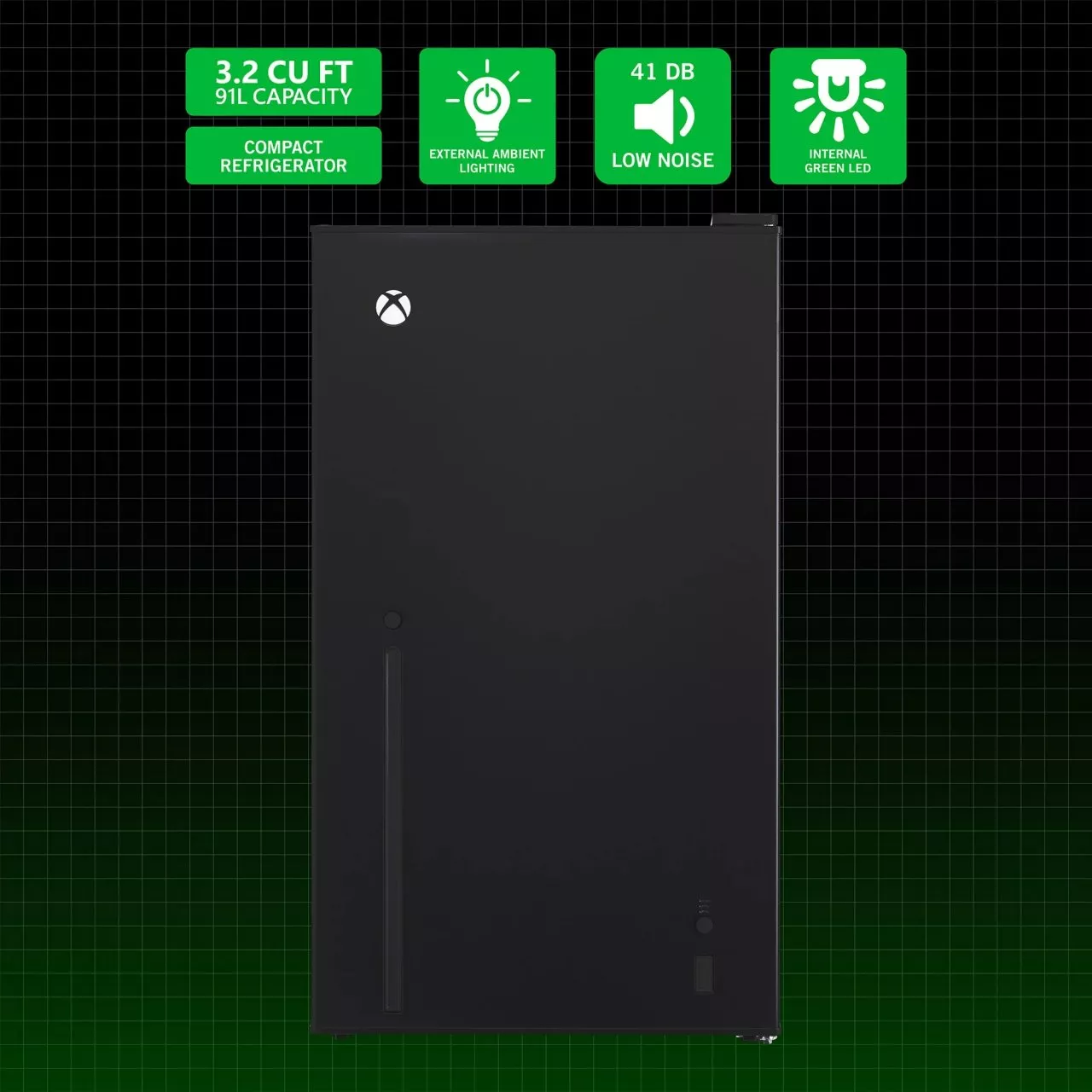Marketed primarily to a gaming audience, this new addition aims to blend seamlessly into the gaming setup with its sleek, matte-black design characterized by an internal green light. It bears the iconic glowing Xbox sphere logo on its front door, adding to its unique gamer aesthetic.